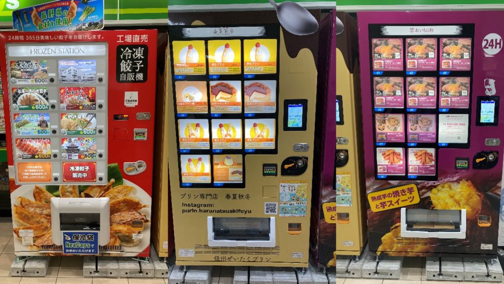 | 装填商品 | ■餃子自販機 ➀馬肉餃子:600円 ②松本一本ねぎ餃子:600円 ③美味だれ餃子:600円 ④わさび餃子:600円 ⑤野沢菜餃子:600円 ⑥唐辛子餃子:600円 ⑦善光寺餃子:600円 ■プリン自販機 ➀飲むプリン(1本):400円 ②天使のプリン福(4個入):1,000円 ③幻のマウンテン:1,600円 ④飲むプリン(2本):800円 ■さつまいもスイーツ自販機 ➀熟成焼き芋(3本):1,000円 ②焼き芋スイートポテト(2個入):650円 ③スティック大学芋:650円 |