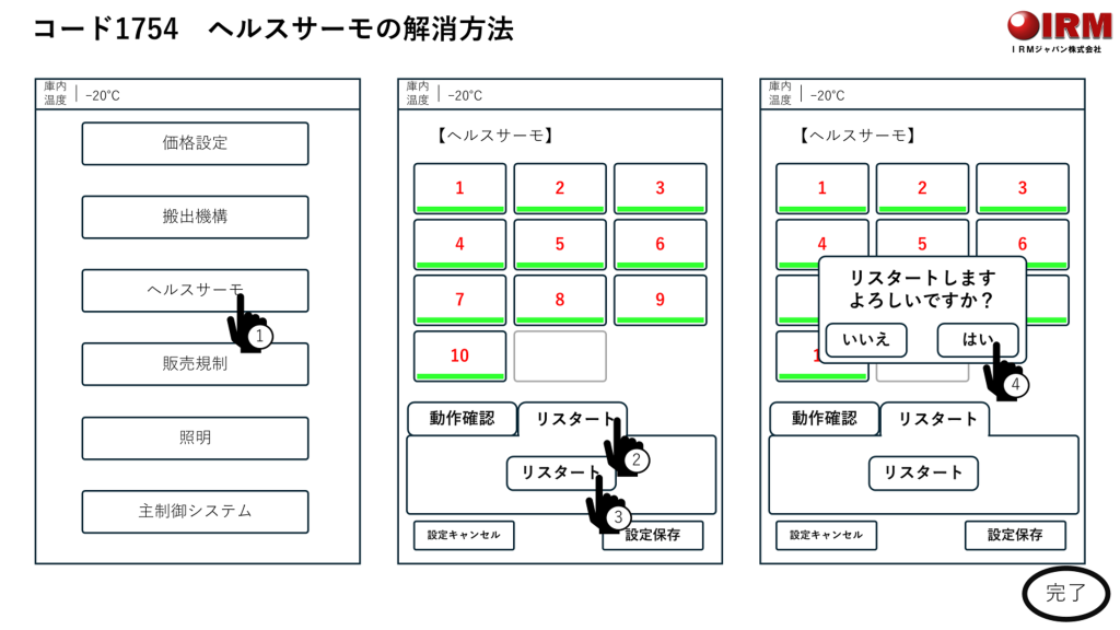 ど冷えもんの扉開いて→液晶画面がメンテナンス画面へ自動変換→「ヘルスサーモ」→「リスタート」→「リスタート」→「はい」。
