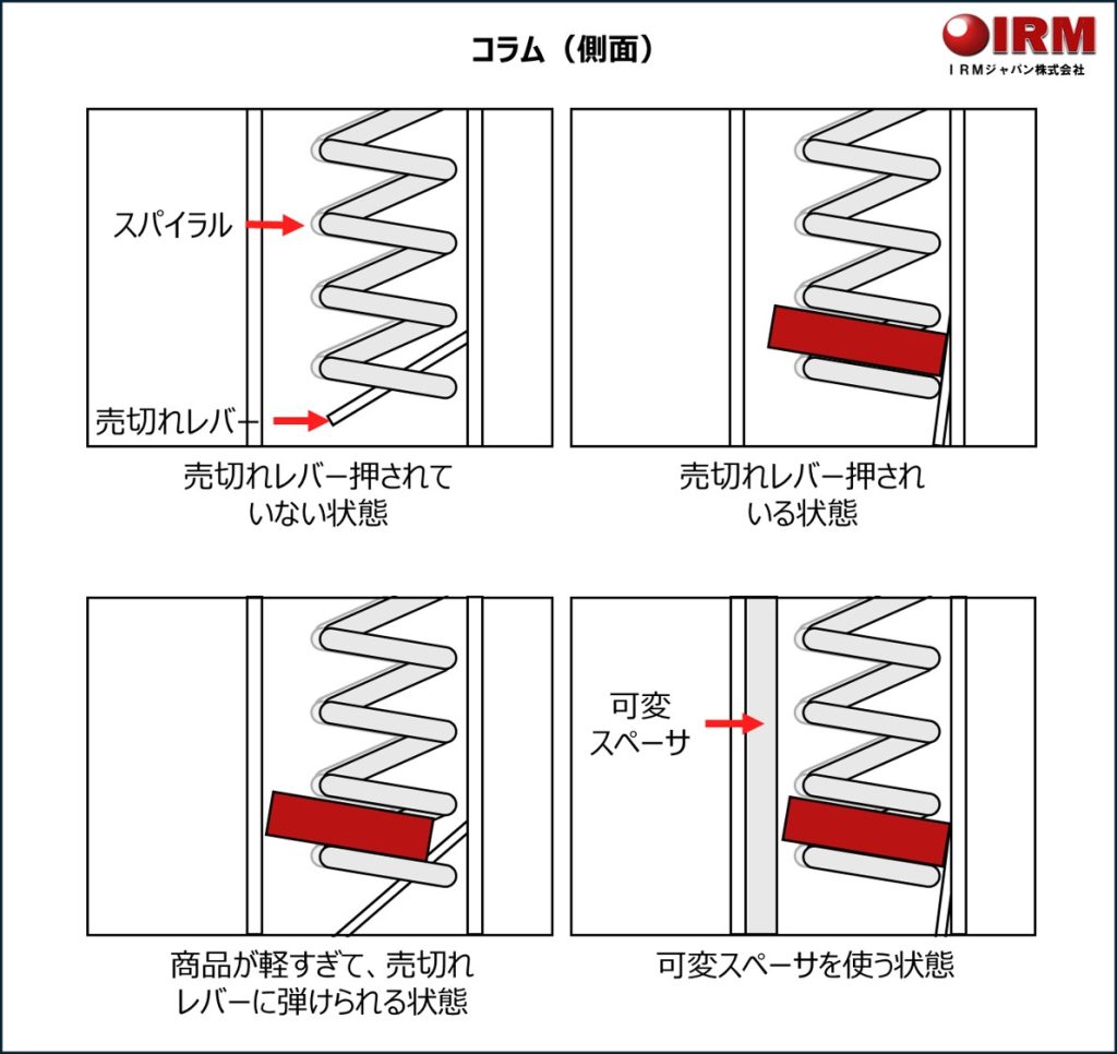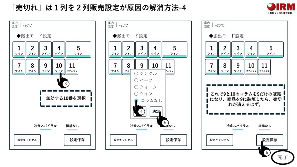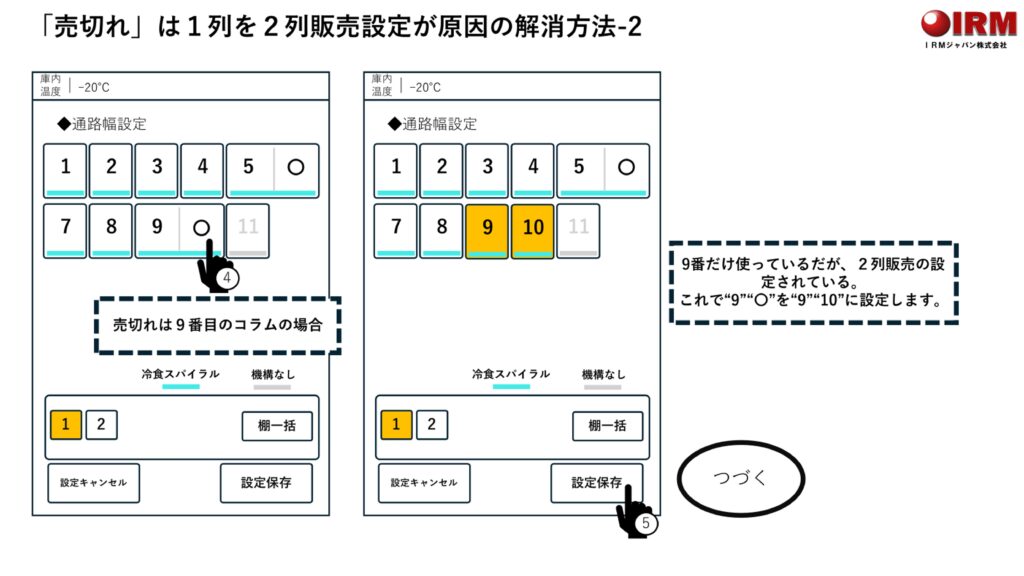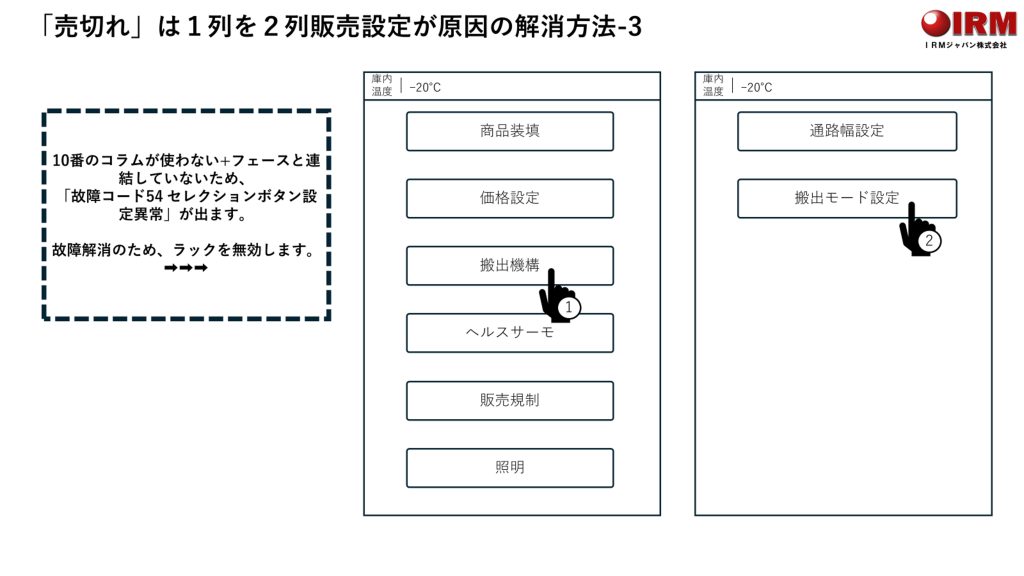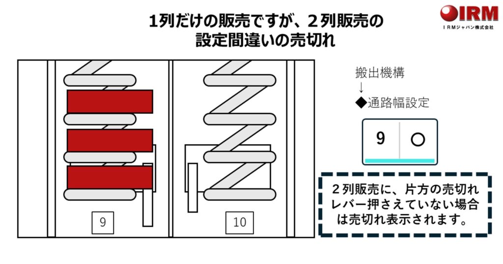 例えば、コラム左側で商品を販売しています、同じコラムの右側が空状態で、どこが設定ミスで、2列販売を設定された。この場合、左側の売切れスイッチが押されたが、右側の売切れスイッチが押されていない。ど冷えもんは商品が装填されていないと感知し、売切れ状態になります。
