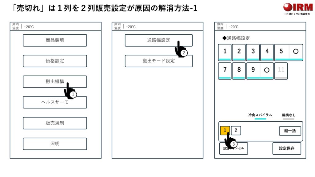 ①、2列販売のコラムを1列販売にします:「搬出機構」→「通路幅設定」→「1」→間違った2列コラムを選択→「設定保存」。