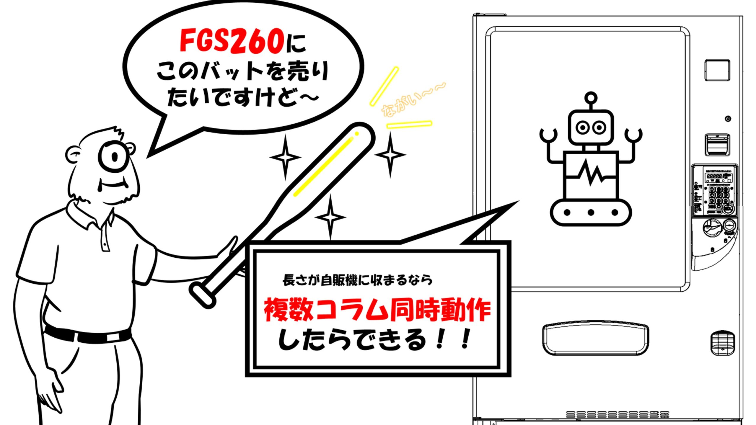 1列のコラムでは販売できない、少々幅が長い商品を販売したいとき。2列や2列以上のスパイラル/ベルトコンベヤーを同時回転の設定方法を案内いたします。